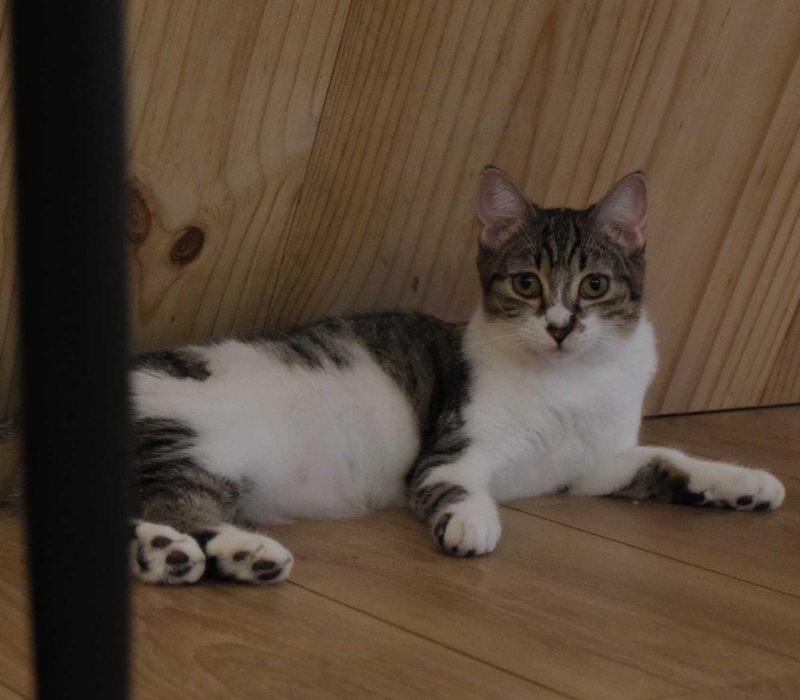 Très gourmande, Ryu a eu un début de vie difficile, ce qui fait d’elle un chat assez peureux avec qui il faut éviter les mouvements brusques et les bruits fort.